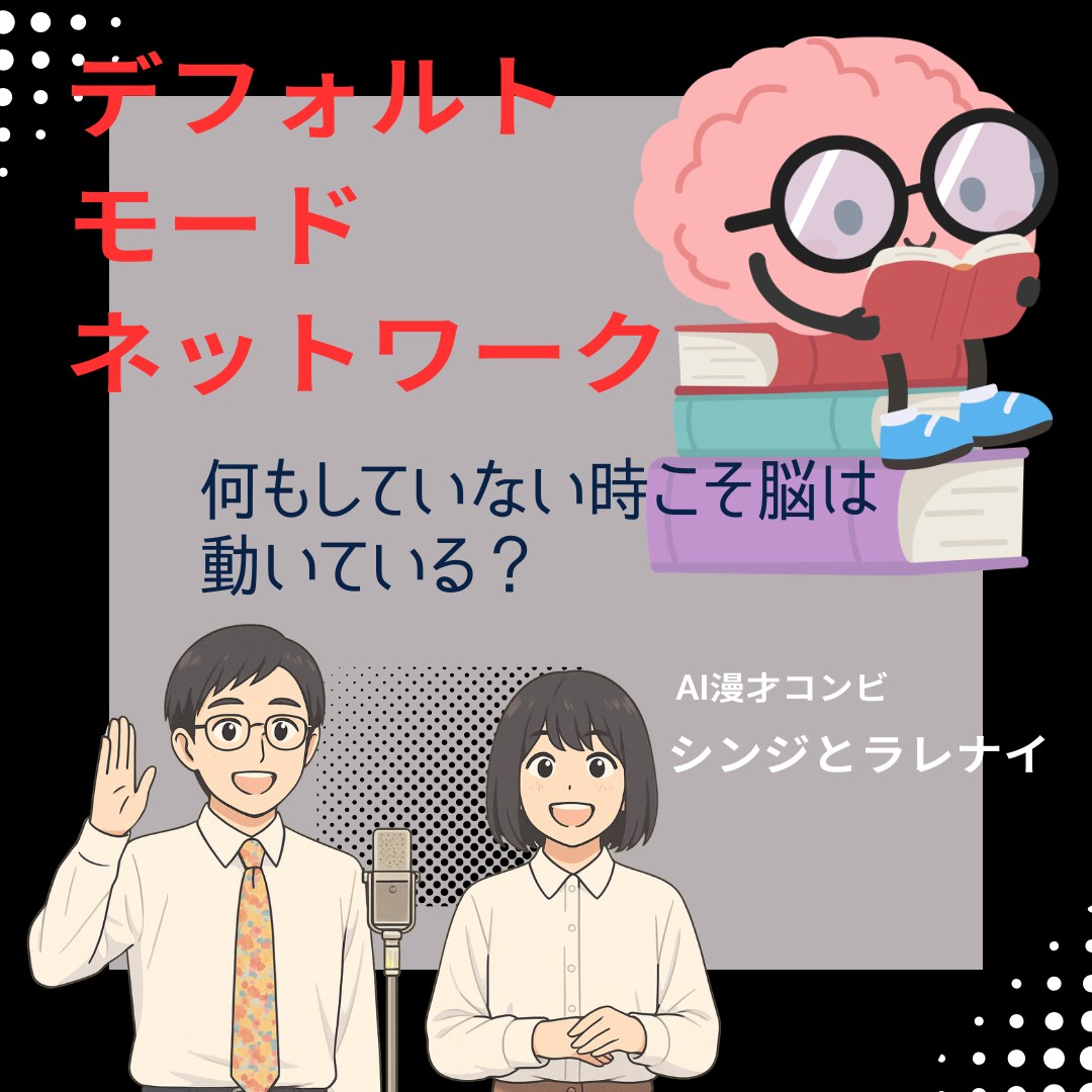 「何もしていない時こそ脳は動いている?」――謎多き脳機能「DMN」を、プリン中毒のシンジと冷静沈着なラレナイが徹底解剖!「脳の暗黒エネルギー」や「反芻」といった難解なキーワードも、二人の軽快な掛け合いなら楽しく学べます。現代人の脳疲労を癒やす、知的でシュールなAI漫才です。