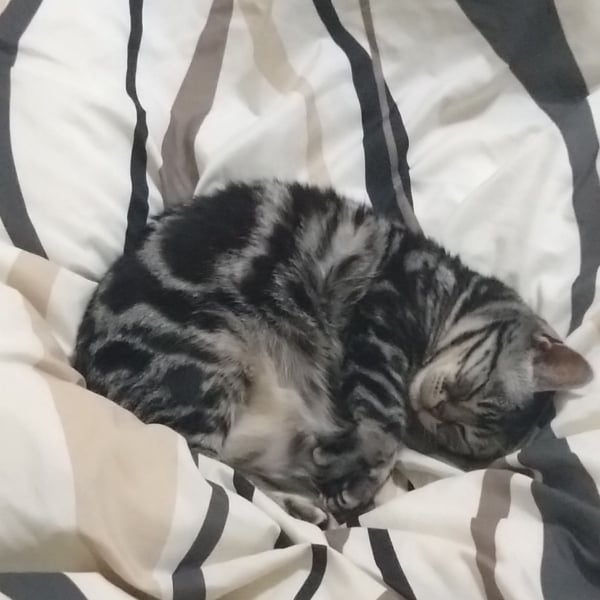 サムネはムスメの布団の上で丸くなる福丸🐱