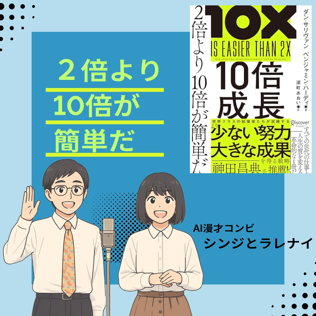 ビジネス書の名著『10倍成長』をテーマに、お調子者のシンジと冷静なAI・ラレナイちゃんが爆笑漫才を繰り広げます。「2倍より10倍の方が簡単」という逆転の発想を、プリンへの執着に絡めて解説。仕事の本質を突く鋭い視点と、噛み合わない二人の掛け合いがクセになる一作です。