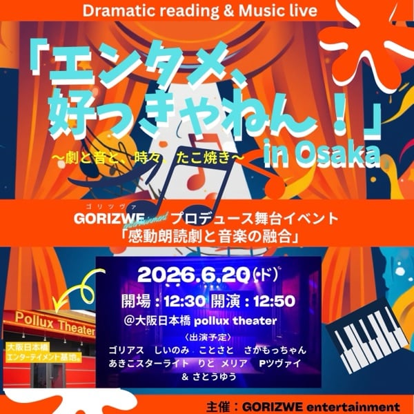 『エンタメ、好っきゃねん‼ in Osaka』 チケット予約サイト🎫 https://peatix.com/event/4948312 2026年6月20日(土) 開場12:30 開演12:50 会場大阪日本橋ポルックスシアター [出演] ゴリアス しいのみ さかもっちゃん ことさと あきこ☆すたーらいと りと メリア  さとうゆう Pツヴァイ 朗読劇と音楽を融合した舞台です! #エンタメ好っきゃねん #ゴリツヴァ ゴリツヴァ2人の発表ライブ👇 https://stand.fm/episodes/69c91e81a1c30ef8510bd92a