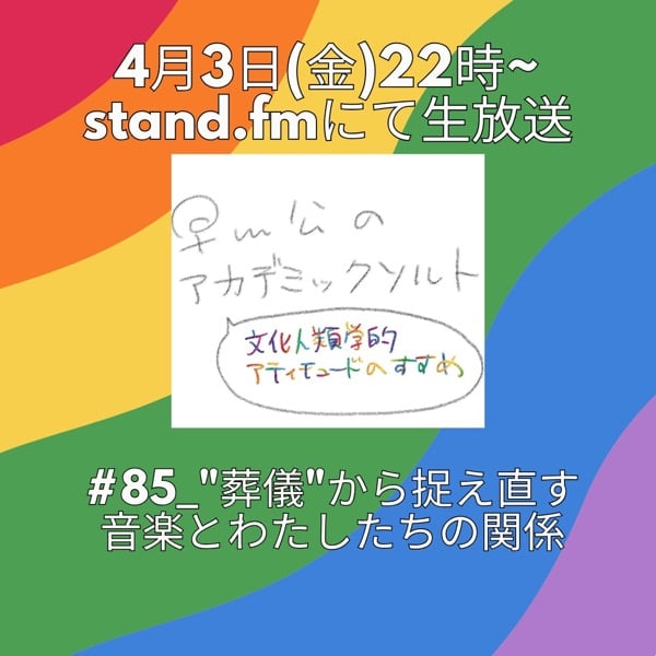 📢4/3(金)22時~生放送〜 第85回『"葬儀"から捉え直す音楽とわたしたちの関係』 アカソル選出!文化人類学界、今年のトレンド🏇 音楽人類学者 田井みのりさん(@minorithailand)をゲストに、葬儀における音楽の研究を聞きながら、音楽の持つ可能性を感じよう🎶🔍 📻視聴はこちら https://stand.fm/channels/5ff3ba011f63b1cf6894827t