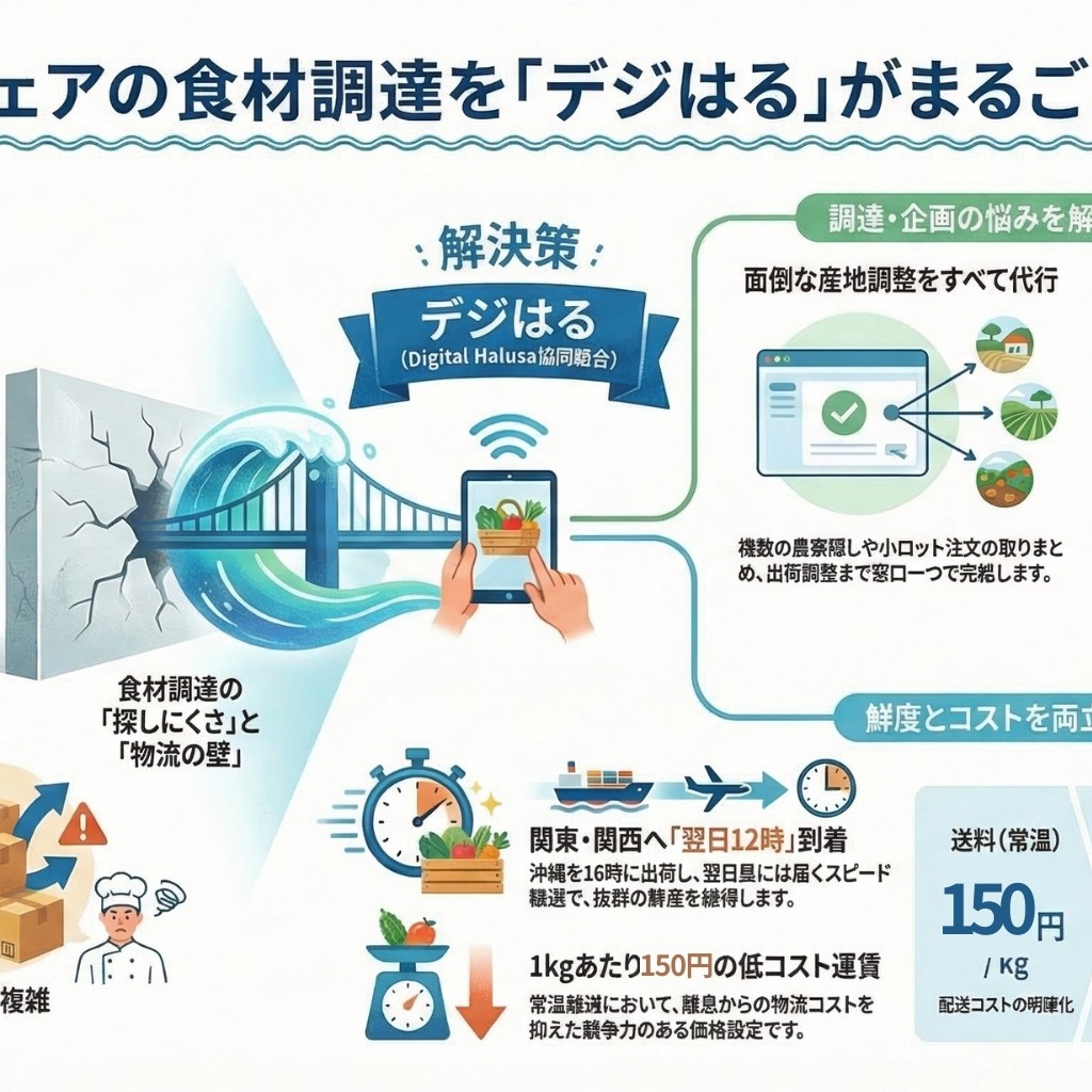 デジはるが窓口となり、食材提案・産地調整・出荷調整までをまとめて支援する構想について解説しています。