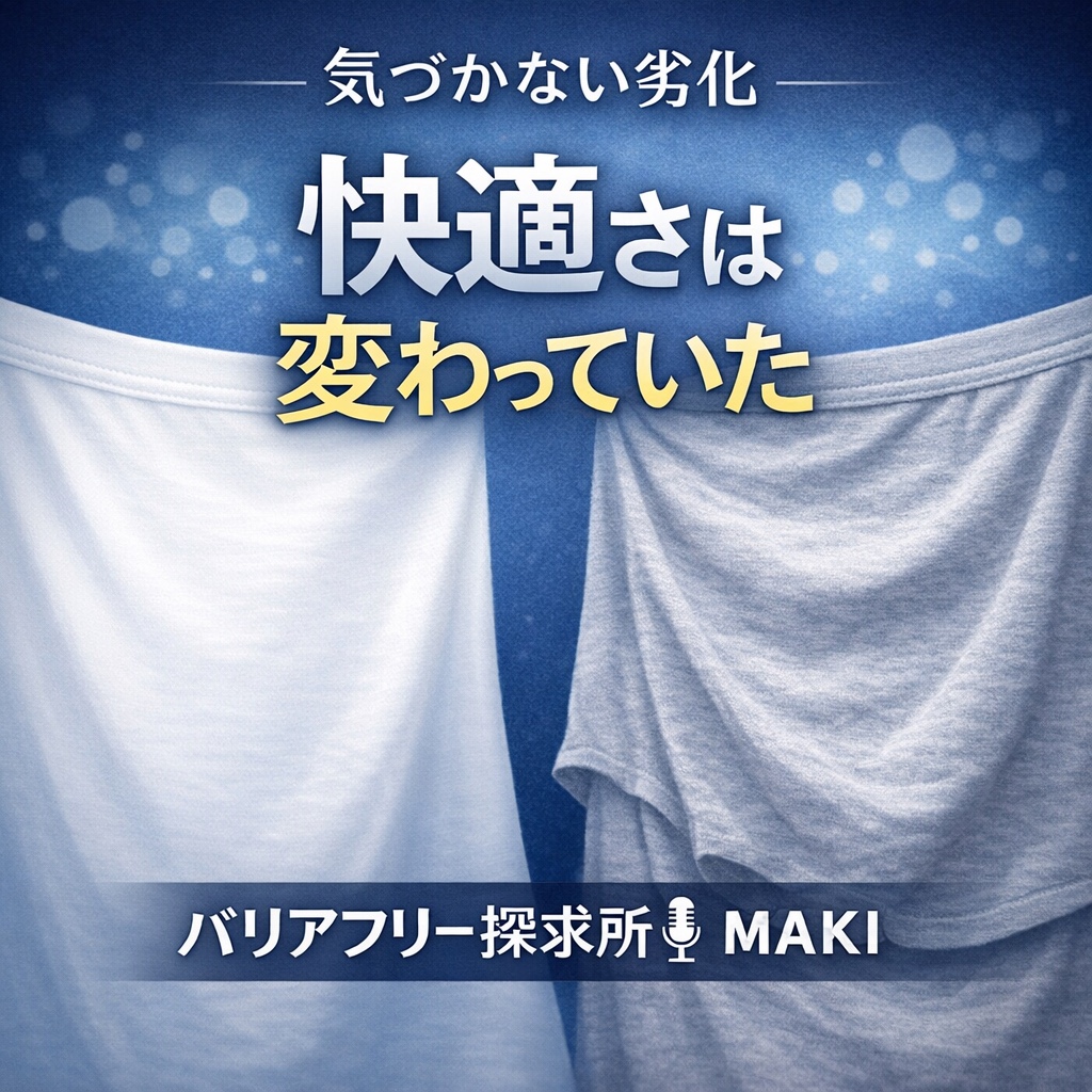 変化する 気づかぬうちに 快適さ 昨日のままじゃ ないことを知る 今日も楽しんで生きましょう! #今日の短歌 #バリアフリー探求所 #バリ探 #エアリズム #ユニクロ #下着の話 #ファッション考察 #素材の違い #気づきの瞬間 #日常の違和感 今回も聴いてくださりありがとうございました。疑問や感想など、お気軽にご連絡ください。