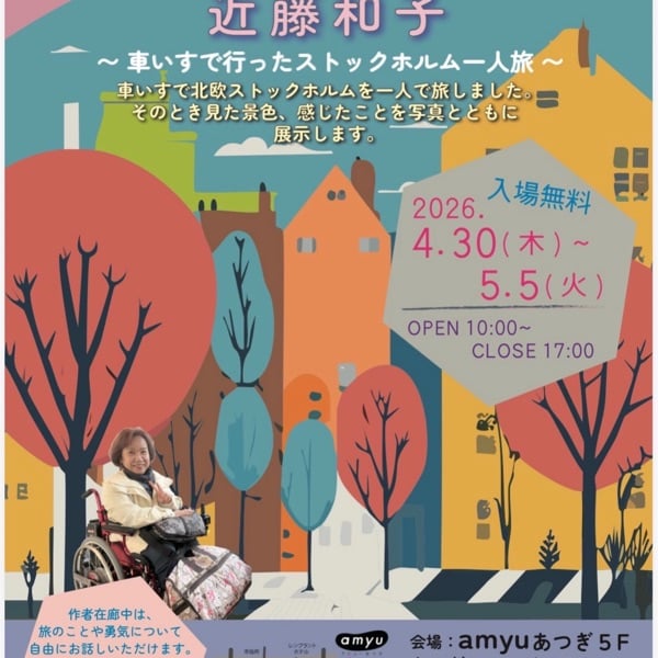 「勇気は1ミリあればいい〜車いすで行ったストックホルム一人旅〜」 会場 厚木市中町2丁目12-15 アミューあつぎ5F あつぎアートギャラリー4 会期 2026年4月30日木曜日〜5月5日火曜日 時間 10:0017:00 入場無料