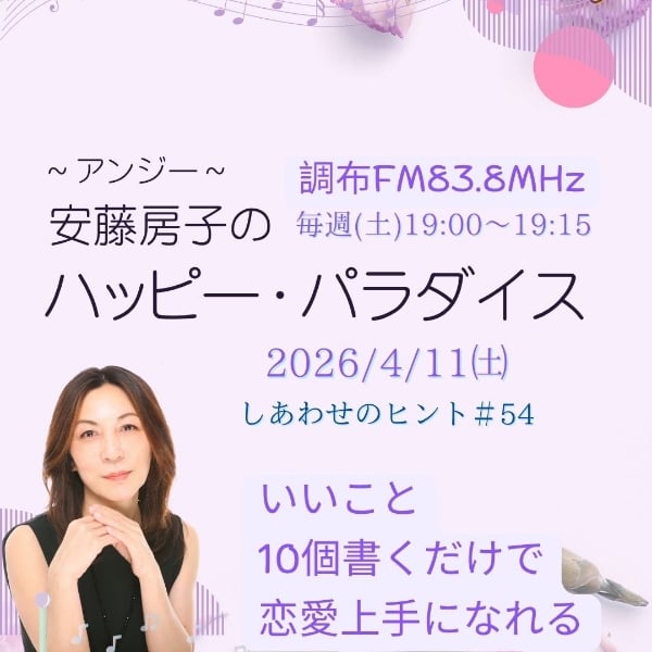 調布FMラジオ安藤房子の「ハッピー・パラダイス」/ 🍀 🍀 🍀 毎週土曜夜7時から調布FMにて放送中! 番組オープニング&エンディングテーマは私・安藤房子が作詞・作曲しています♪ こちらの楽曲もぜひ聴いてみてくださいね。 ★放送エリア外でもリスラジでリアタイで聴けます♪ https://listenradio.jp/ ★過去アーカイブはコチラからどうぞ! https://note.com/anzy/m/m0c67561a9e74 ★公式サイトのラジオページはコチラ! https://heart-junction.com/notice/happy-paradice20250412.html ★番組公式インスタはコチラ https://www.instagram.com/happy_paradice/ ★#1~#16までのアーカイブはnoteで聴いてくださいね。noteでの音声配信終了にともない、スタエフにお引越ししてきました。 https://note.com/anzy/m/m0c67561a9e74 ★スタエフでは、私のガン闘病記もしています。超じみ~……(笑)よければどうぞ。 https://stand.fm/channels/626db4d9fd1be6fc4648b2ee #恋愛心理 #恋愛心理研究所 #恋愛カウンセラー #恋に効く魔法 #恋愛カウンセリング #調布FM #メディア #メディア出演 #恋愛コメンテーター #ラジオDJ