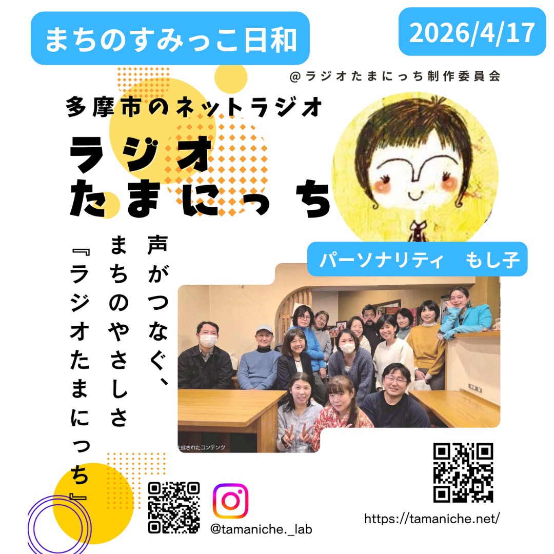 あなたの声が、まちを元気にする。 ひとりの時間も、みんなの時間も、 いつもの暮らしのすぐそばで、 毎日をニコッと過ごせる 多摩のニッチな情報をお届けします。 多摩を愛する誰もが パーソナリティーに。 日常の小さな発見や、 まちのやさしさが、 声となってつながっていく。 今日も、あなたのそばに。