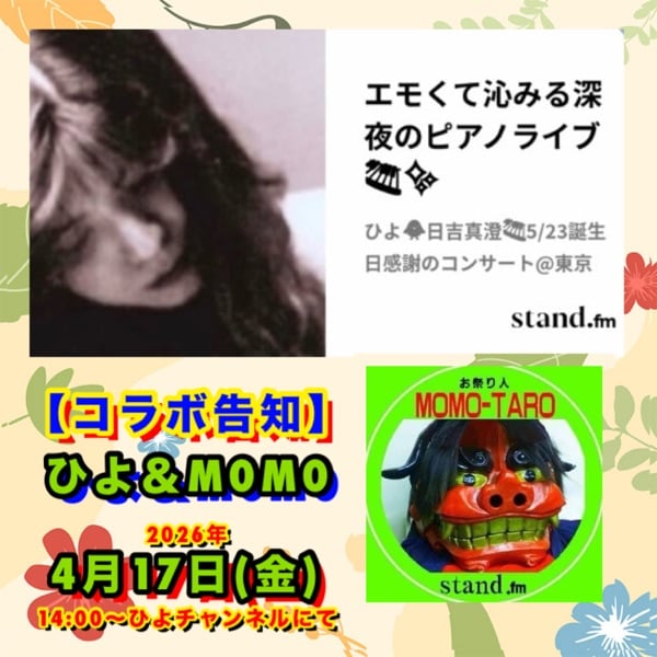 【コラボLIVE告知】 エモくて沁みる深夜のピアノライブチャンネル ひよサンと・・・ 2026年 4月 17日(金) 14時〜 ひよサンのチャンネルにて! https://stand.fm/channels/5edf0b0d9c38bc0326ee25f4 17時05分〜 エニアグラムじゅんちゃんチャンネルにて・・・ 金曜日の定期コラボ https://stand.fm/channels/61e6ac1c299c4d50055961b5 ぜひ、聞きにお越しください。 #コラボ #コラボライブ #ライブ告知 #LIVE #MOMO-TARO