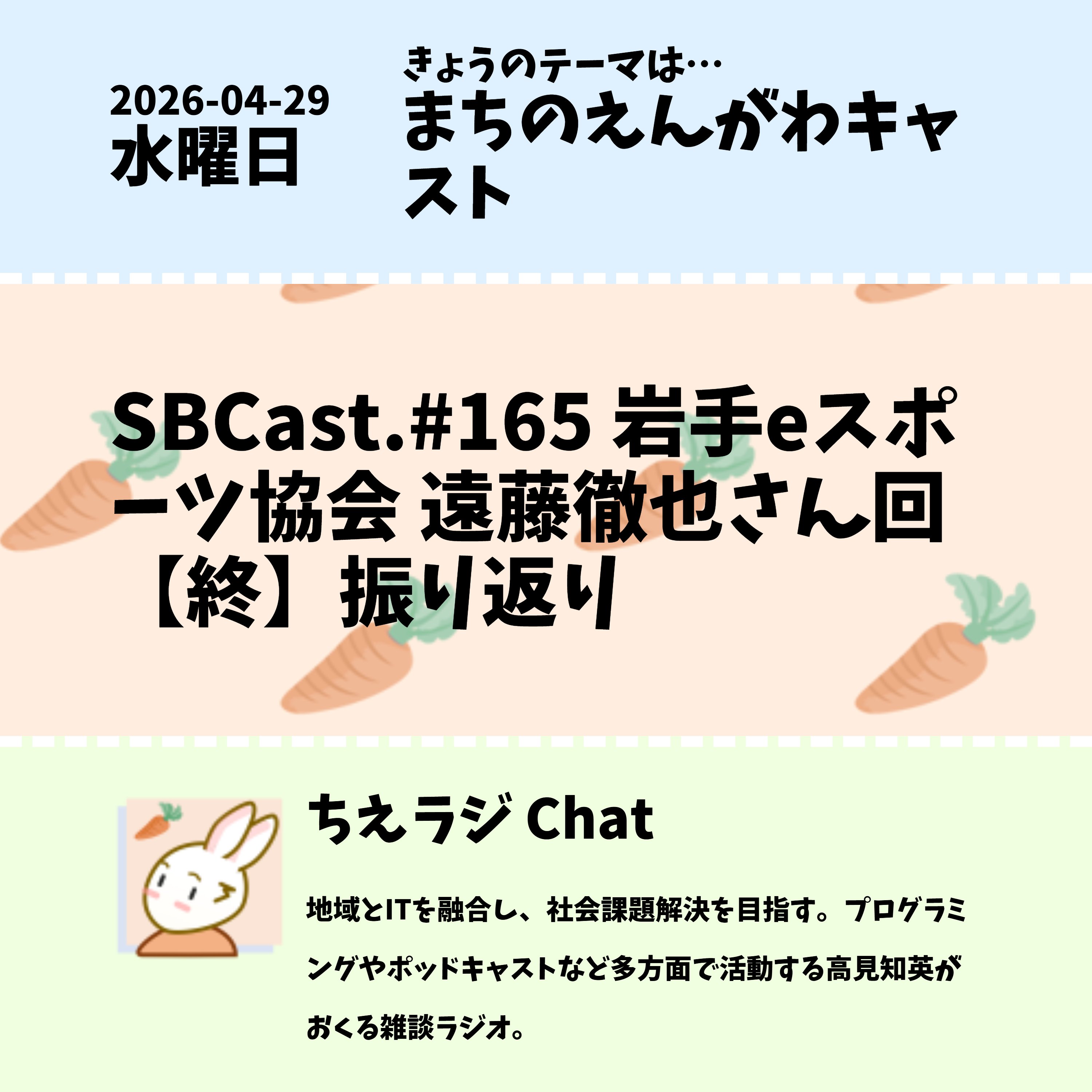 先日放送したSBCast.#165 岩手eスポーツ協会の遠藤徹也さんに起こし頂いた回の振り返りをしました。 #ポッドキャスト #声日記 #ちえラジえんがわキャスト
